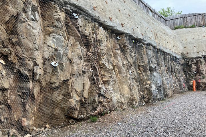 Auf unserer Baustelle im Blickwinkel des Doms in St. Blasien finden aufwendige Arbeiten im Bereich der Baugrube statt. Ein Stahlgitternetz schützt vor herabstürzenden Felsbrocken. Schon jetzt ist erkennbar: diese Baustelle ist keine gewöhnliche. Rund 20.000 Tonnen Fels wurden gesprengt und als Tragschicht für den Untergrund wiederverwendet.