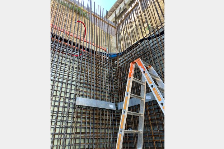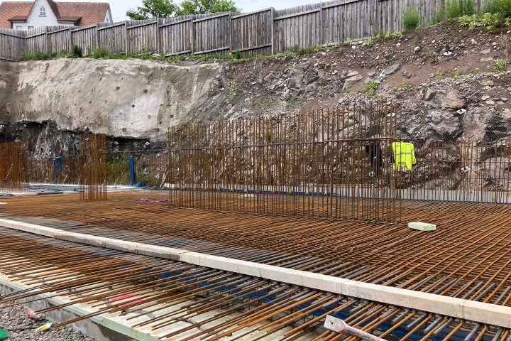 Aufgrund der Einbettung im Berg und der enormen statischen Kräfte werden Stabstahl-Riegel in engen Abständen sowohl im Boden als auch in den Wänden verlegt. Diese sorgen dafür, dass der WU-Beton den gewaltigen Druck des künftigen Baukörpers aufnehmen kann.