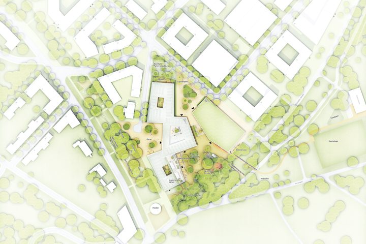 Der Neubau der Schule schafft mit seiner Positionierung am südwestlichen Rand des Grundstückes einen starken Auftakt zum neuen Stadtteil. Das Ensemble aus Schule und Sporthalle mit differenzierter Höhenentwicklung fügt sich dabei sensibel in den angrenzenden Landschaftsraum ein. Die Baukörper sind nach Funktionsbereichen gegliedert, und vermitteln durch ihre differenzierte Gestaltung zwischen der kleinteiligen Bestandsbebauung und den großmaßstäblichen Neubauten des Stadtteils.