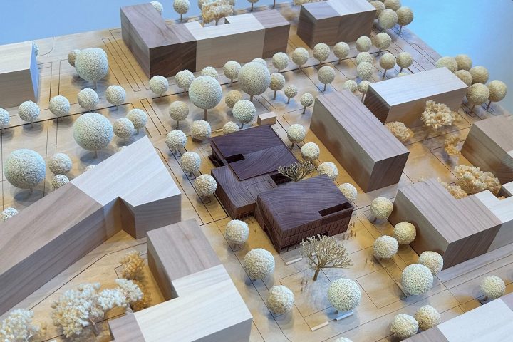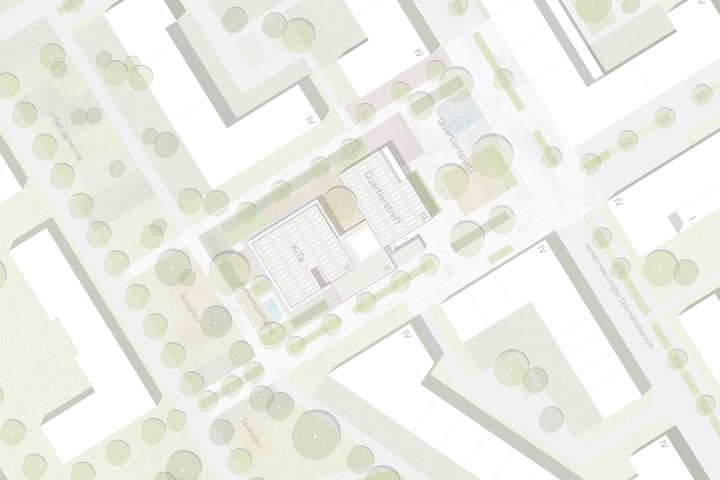 Das neue Quartiershaus Q1 verbindet die Freibereiche des Quartiersplatzes mit dem südwestlich verlaufenden Grünzug. Es besteht aus versetzt angeordneten Kuben, die architektonische Akzente setzen und individuelle Außenbereiche schaffen. Das Raumkonzept ist in einzelne Nutzungsbereiche gegliedert, die in der Baukörperform ihre Entsprechung finden. Der kompakte, dreigeschossige Baukörper mit dem Quartierstreff orientiert sich zum Quartiersplatz, während die 6-gruppige Kita im pavillonartigen, zweigeschossigen Baukörper sich zum umliegenden Grünraum hin öffnet. Die weitere Anordnung der Räume erfolgt nach den funktionalen Anforderungen und einer Hierarchisierung von öffentlichen zu privaten Räumen. Der Eingang der Kita ist ebenfalls zum Quartiersplatz hin orientiert, mit einem Vorplatz, der der Einrichtung eine eigene Adresse verleiht.