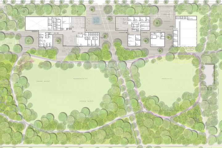 Im Mittelpunkt unseres Entwurfs steht das Naturerlebnis als pädagogisches Leitmotiv. Eine durchgehende Waldzone mit Lichtungen für unterschiedliche Nutzungen prägt den Campus. Der Haupteingang liegt zentral auf dem Campus. Eine Magistrale verbindet Lernhäuser, Fachräume, Forum, Sport- und Freibereiche und schafft die Schnittstelle zwischen Schule und Stadtteil, wodurch die Schule räumlich ins Quartier eingebunden wird.