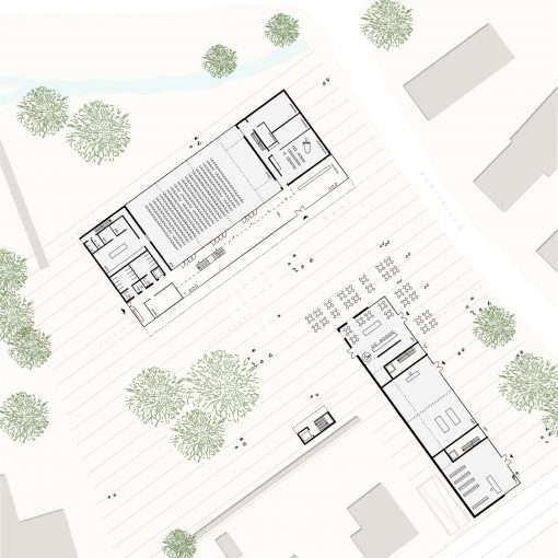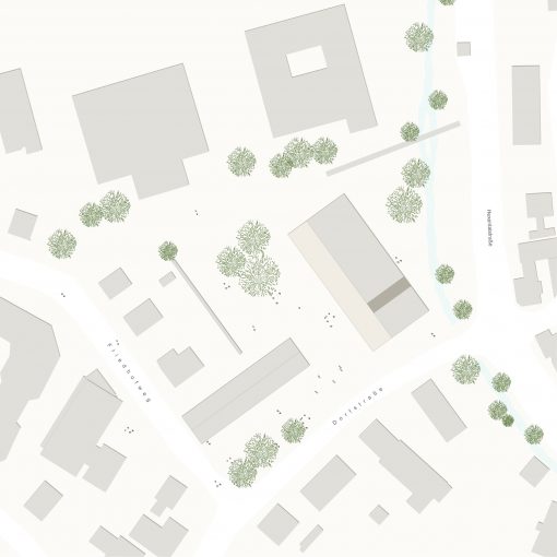 Durch den Rückbau der Straße entsteht vor dem Gebäude eine platzartige Situation, die öffentliche Nutzungen, wie z.B. den Wochenmarkt oder die Freisitze des Cafés an der Ecke aufnimmt. Den unteren Abschluss dieses kleinen Platzes bildet das orthogonal angeordnete Bürgerhaus mit Zugang von hier. Das Bürgerhaus orientiert sich mit dem Saal zum weichen Grünraum des Dorfbachs, mit dem Foyer zum großen Dorfanger, dem Platz in zweiter Reihe. Mittelpunkt des Angers ist die bestehende Baumgruppe aus Platanen. Hier können größere Veranstaltungen und Feste (Dorfhock) stattfinden, ein Teil des Platzes kann wie bisher von der Schule genutzt werden. Die Buswendeschleife soll bis zur Fertigstellung der Stadtbahn zum Hallenbad verlegt werden.